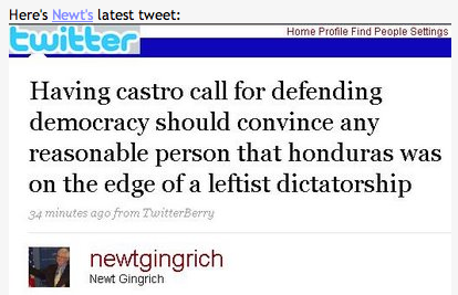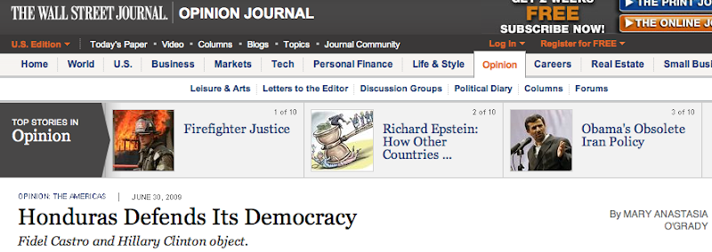 4. And then there is always of course the "top stories" on the manufactured Opinion pages of Rupert Murdoch's Wall Street Journal, "Honduras Defends Its Democracy - Fidel Castro and Hillary Clinton Object", in which Mary Anastasia O'Grady explains that the coup is not a coup at all, and that the Hondurans are sure to be "celebrating" Zelaya's removal.
