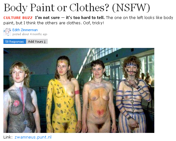WARNING: The BuzzFeed content hereunder may or may not contain nudity, and may, accordingly, be or not be deemed suitable for viewers under the age of 18. If you choose to continue and follow the link hereunder, it is assumed that you are 18 or older (depending on local laws) and are not offended by pictures of the naked body, painted or clothed, as the case may or may not be.